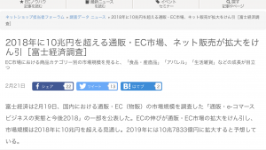 “2018年に10兆円を超える通販・EC市場、ネット販売が拡大をけん引[富士経済調査]” ネットショップ担当フォーラム 2018年2月18日 2018年に10兆円を超える通販・EC市場、ネット販売が拡大をけん引[富士経済調査]” ネットショップ担当フォーラム 2018年2月18日 https://netshop.impress.co.jp/node/5175