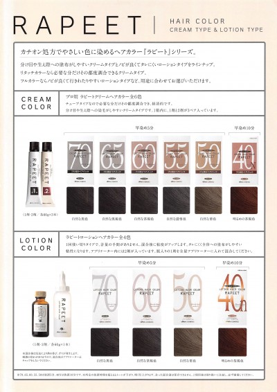 カチオン処方でやさしい色に染めるヘアカラー『ラピート』シリーズ。