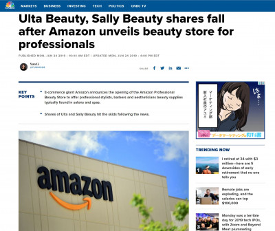 (CBNC 2019/06/25: https://www.cnbc.com/2019/06/24/ulta-beauty-shares-fall-after-amazon-unveils-beauty-store-for-proffessionals.html)