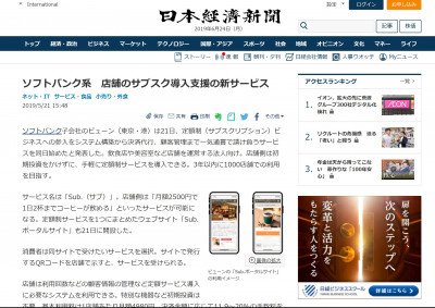 ソフトバンク子会社のビューン(東京・港)は21日、定額制(サブスクリプション)ビジネスへの参入をシステム構築から決済代行、顧客管理まで一気通貫で請け負うサービスを同日始めたと発表した。飲食店や美容室など店舗を運営する法人向け。店舗側は初期投資をかけずに、手軽に定額制サービスを導入できる。3年以内に1000店舗での利用を目指す。